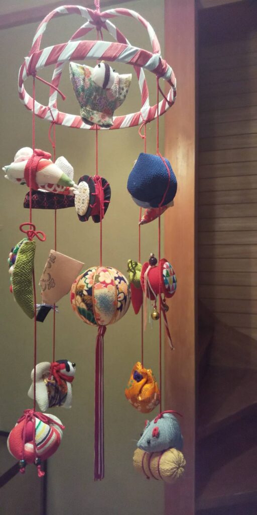 What makes this display unique are the accompanying Tsurushi-bina (hanging ornaments) and the Takasago dolls. The Takasago dolls—an elderly couple named Jo and Uba—symbolize a long and happy life together (“growing old in harmony”).