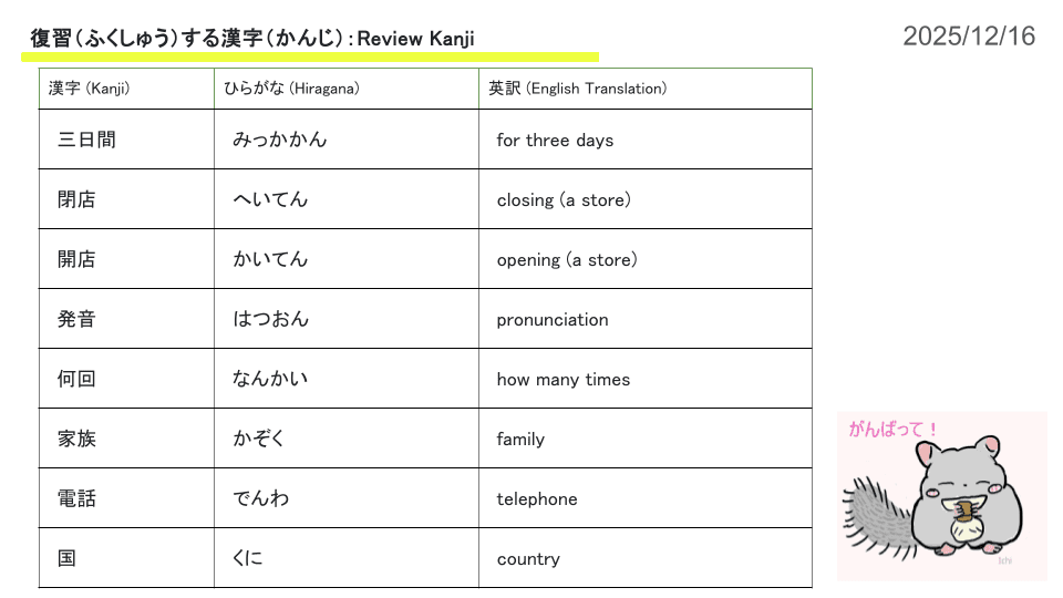 Each Teen Kanji Challenge begins with a list of kanji to review. These are kanji that students had difficulty reading, writing, or remembering during class.