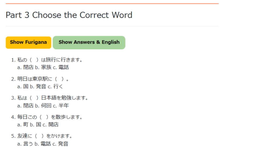 This online tool supports kanji review through three simple steps, allowing students to study at their own pace. At the end of each series, a final check helps students see how much they remember and understand. Answers can be checked immediately, making review efficient and stress-free.